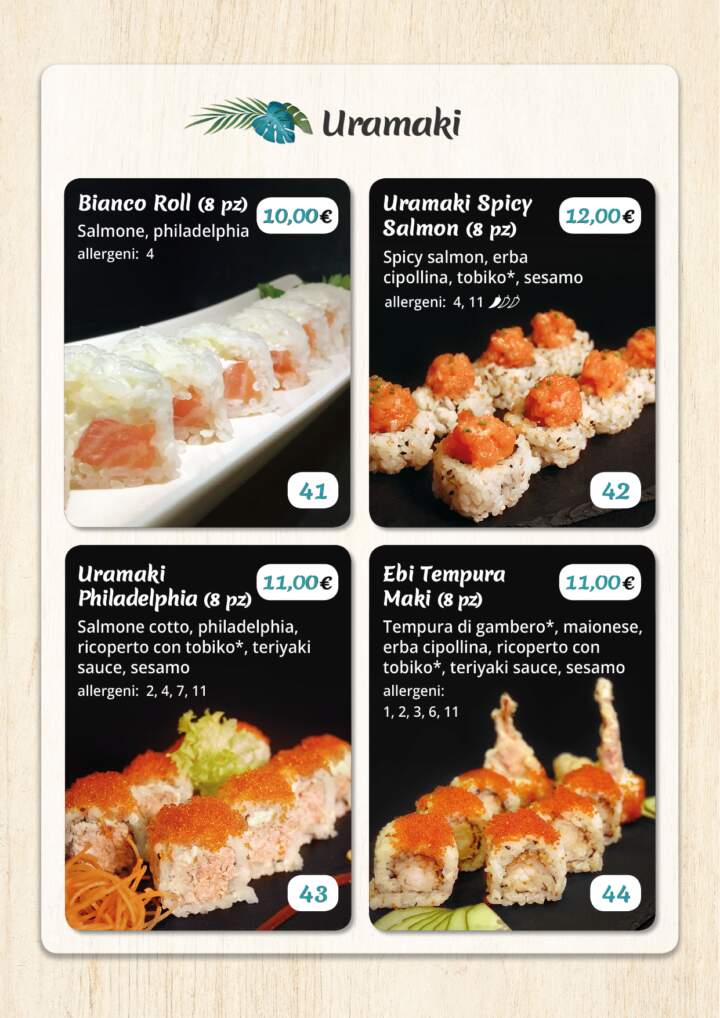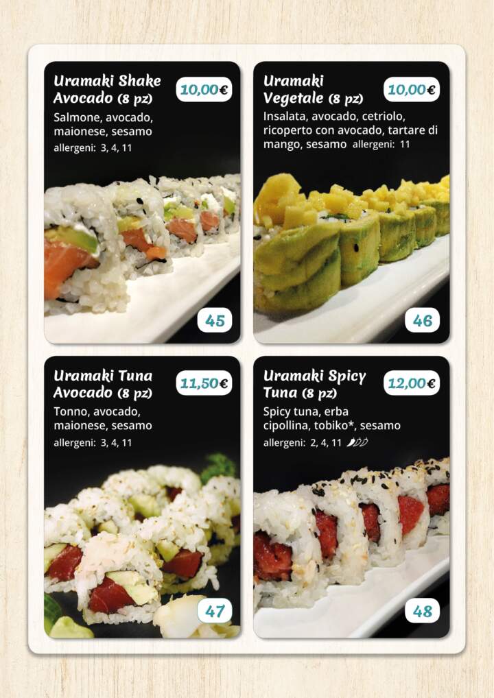 Fare un ordine è molto semplice! Dopo aver consultato i nostri menu (Menu Sushi-Uramaki, Menu Poke o Ingredienti Poke) basta inviare un messaggio WhatsApp al numero 371 350 4318 per prenotare l'asporto mentre, per la consegna a domicilio, cliccando sul riquadro sottostante potrete effettuare l'ordine direttamente su Glovo* e Deliveroo*. Per tutti gli ordini è disponibile il pagamento alla consegna, in contanti o carta di credito (tramite POS).